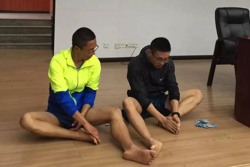 培訓(xùn)師方慶(圖右)帶領(lǐng)跑友現(xiàn)場演示賽前按摩